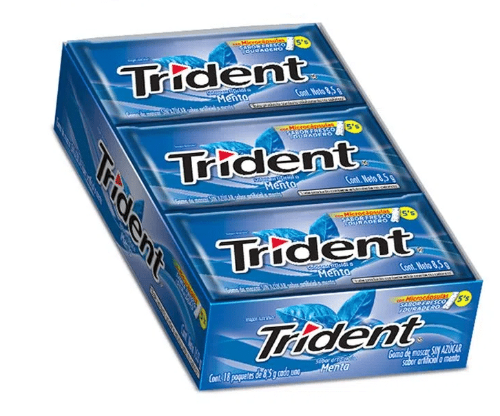 Chicle Trident de menta en display con 18 unidades.