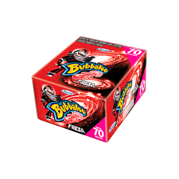 Chicles Bubbaloo de fresa en presentación de display con 70 unidades.